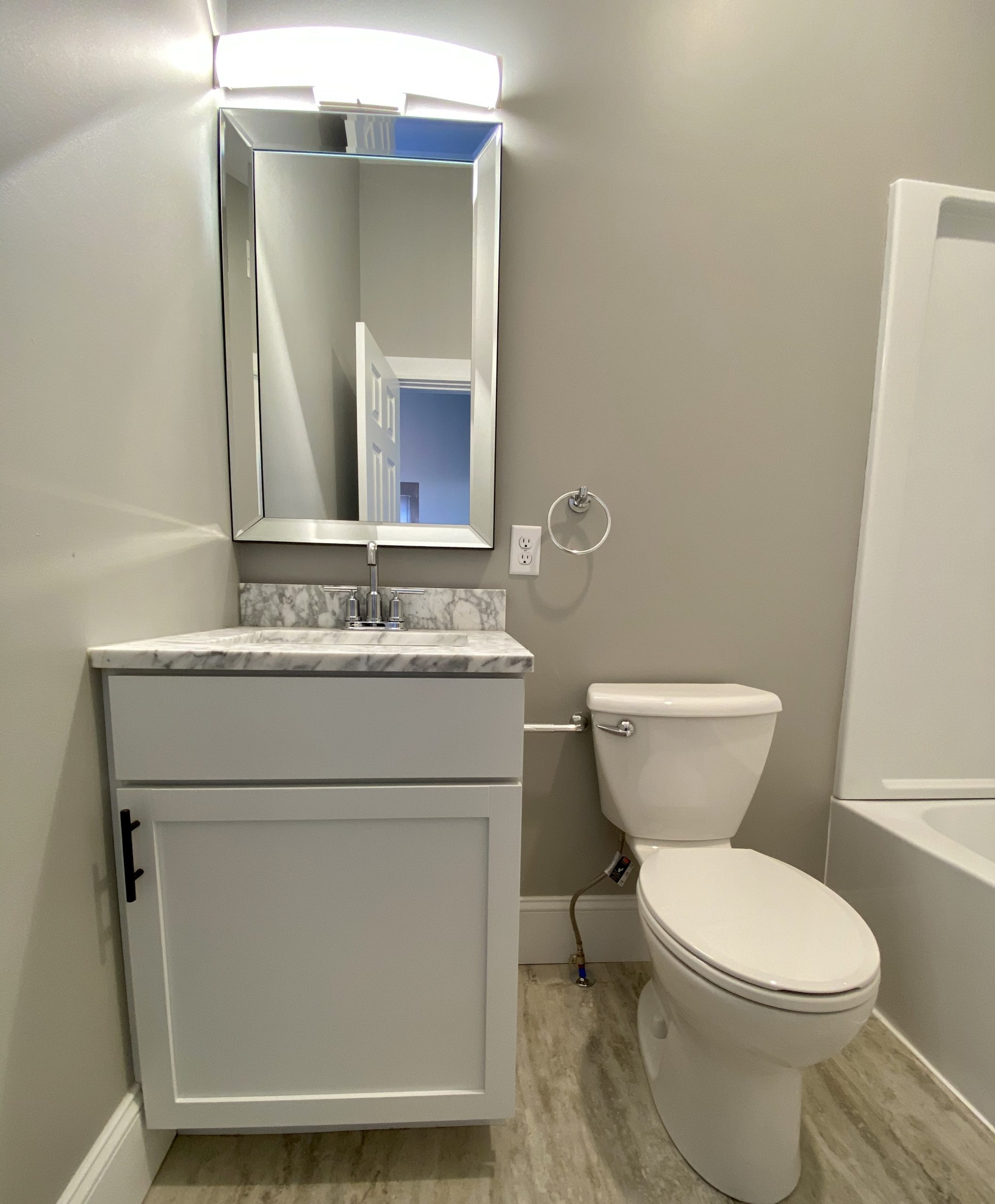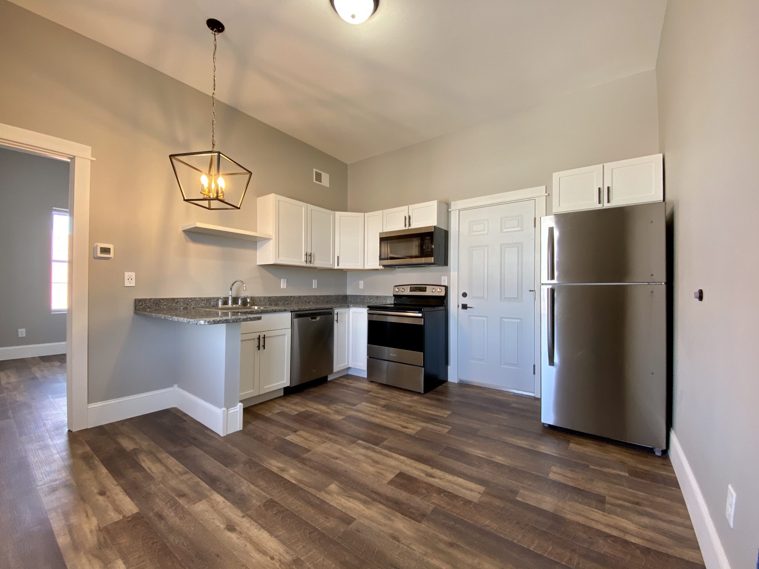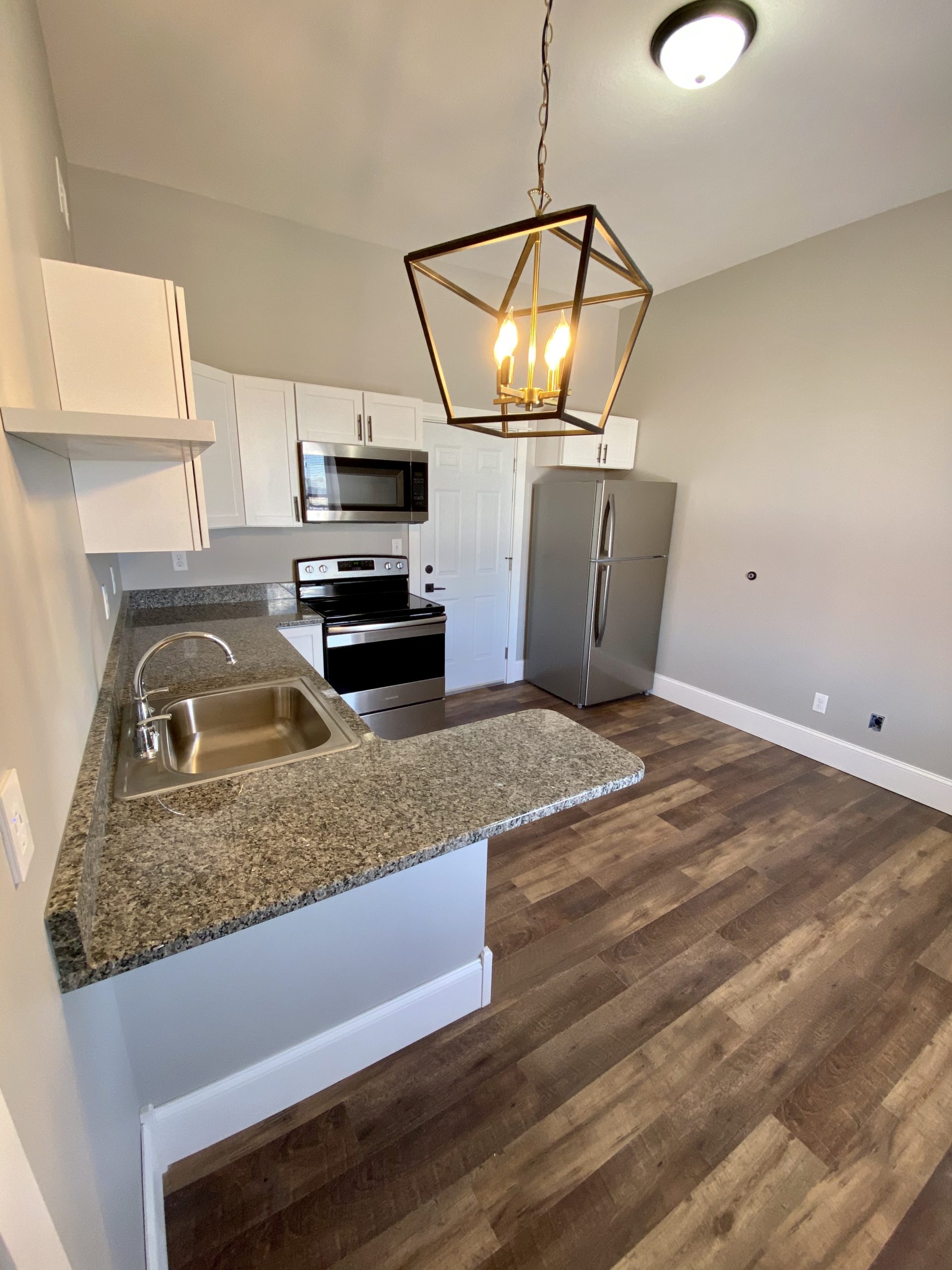 Efficient 1-bedroom apartment featuring granite countertops, 10-foot ceilings, modern geometric lighting, and updated bathroom with marble-look vanity