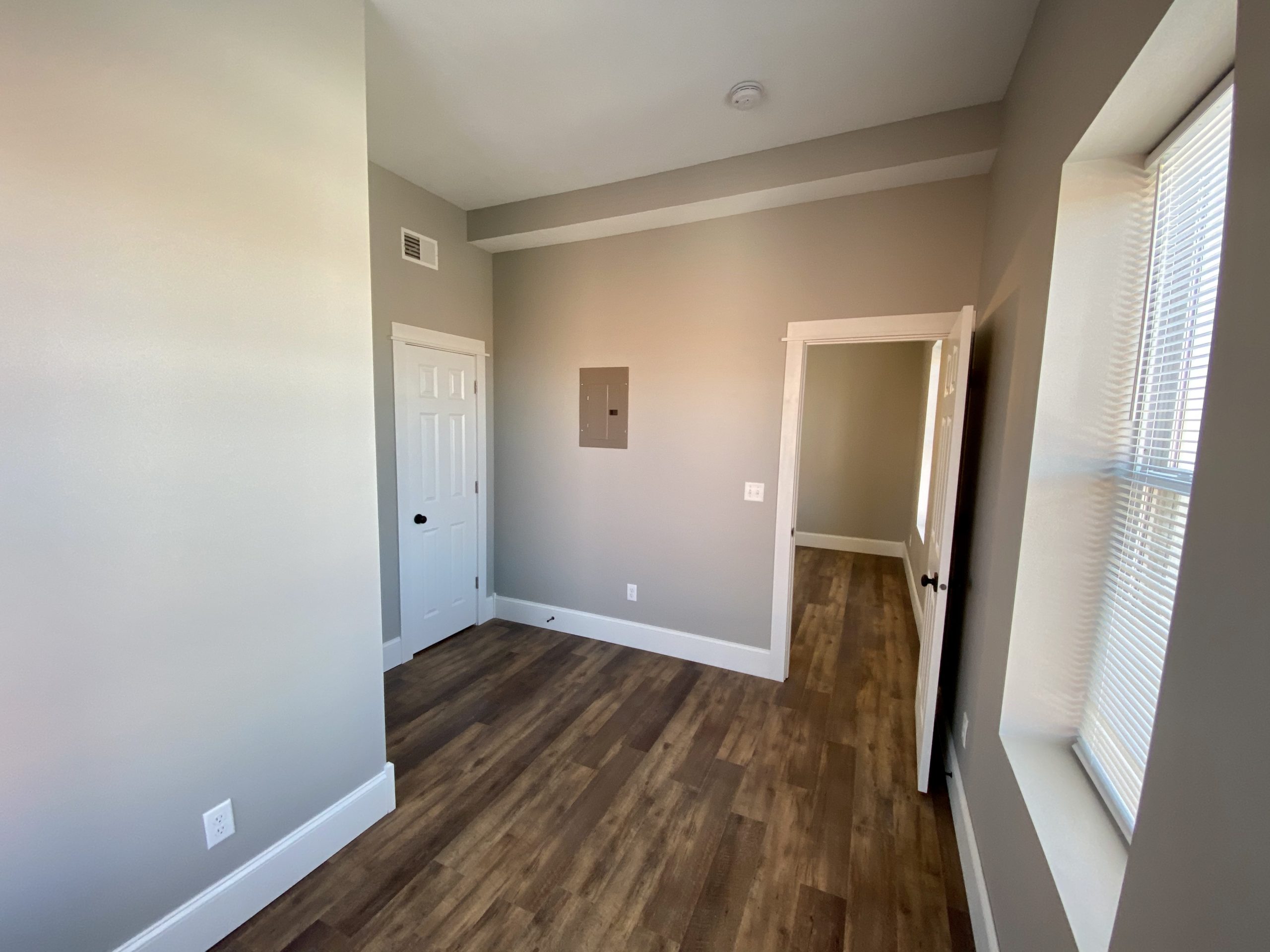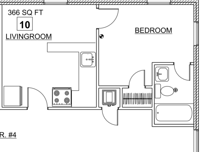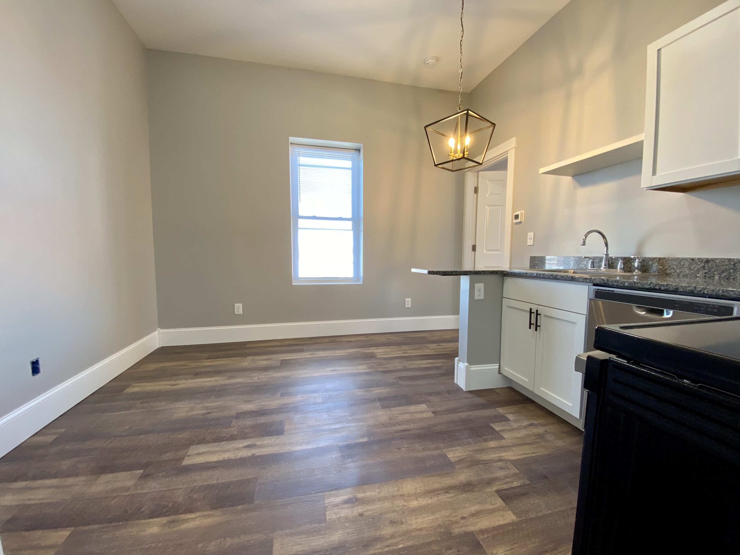 Efficient 1-bedroom apartment featuring granite countertops, 10-foot ceilings, modern geometric lighting, and updated bathroom with marble-look vanity