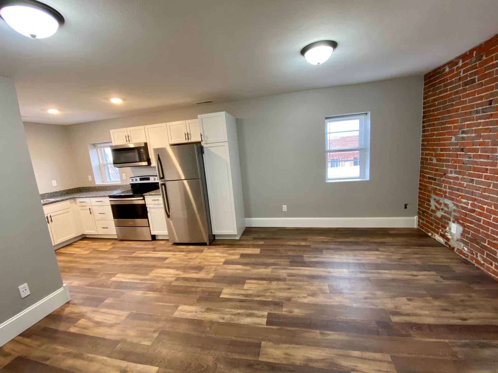 Stunning one-bedroom unit featuring a dramatic exposed brick accent wall and beautiful hardwood floors throughout. Open concept living with modern kitchen featuring granite countertops, stainless steel appliances, and custom white cabinetry. Corporate furnished option available for an additional $200/month.